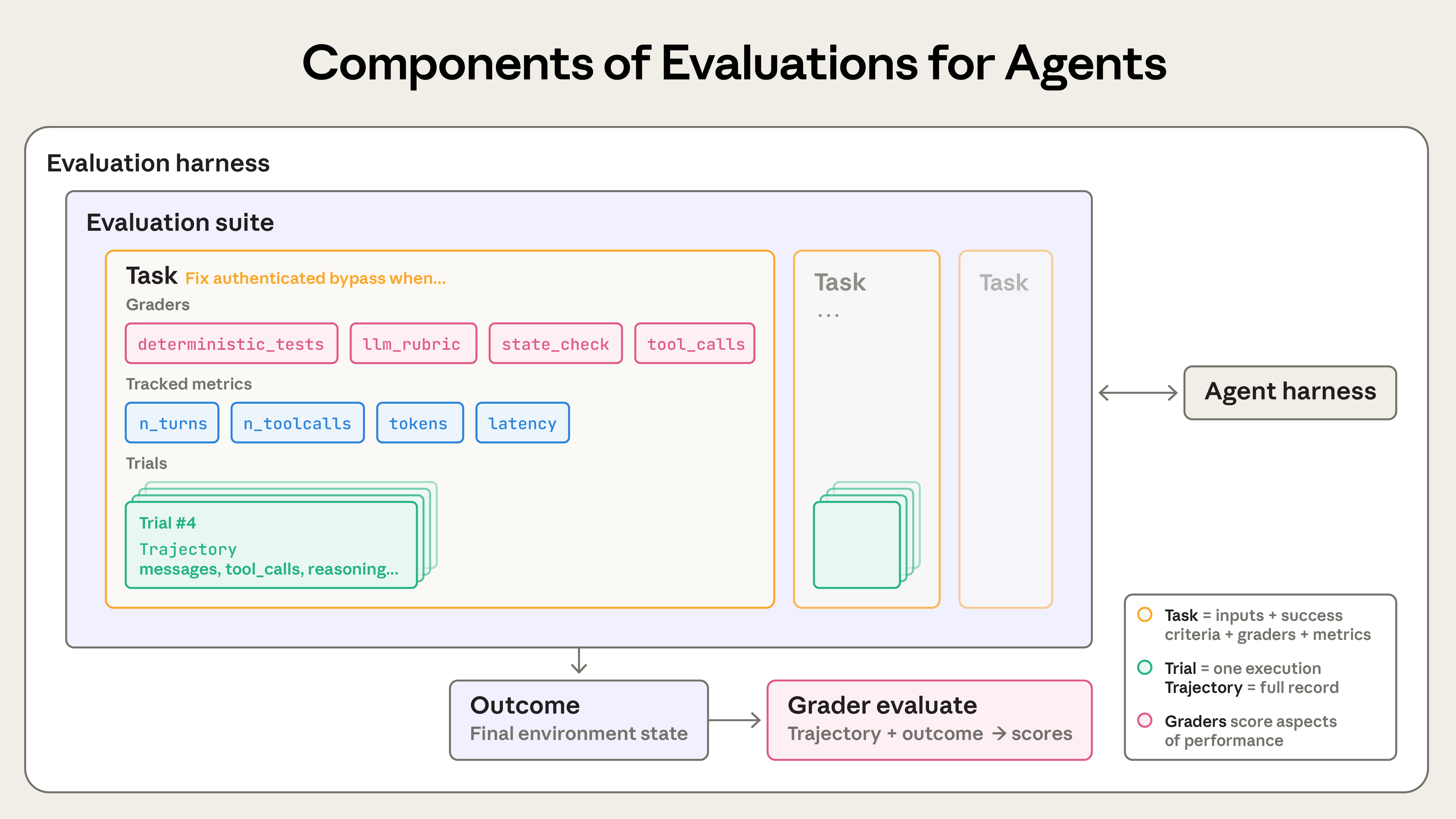 - Qiymətləndirmə çərçivəsi (evaluation harness) qiymətləndirmələri başdan-sona icra edən infrastrukturdur. O, təlimatlar və alətlər təmin edir, tapşırıqları paralel icra edir, bütün addımları qeyd edir, çıxışları qiymətləndirir və nəticələri toplayır.