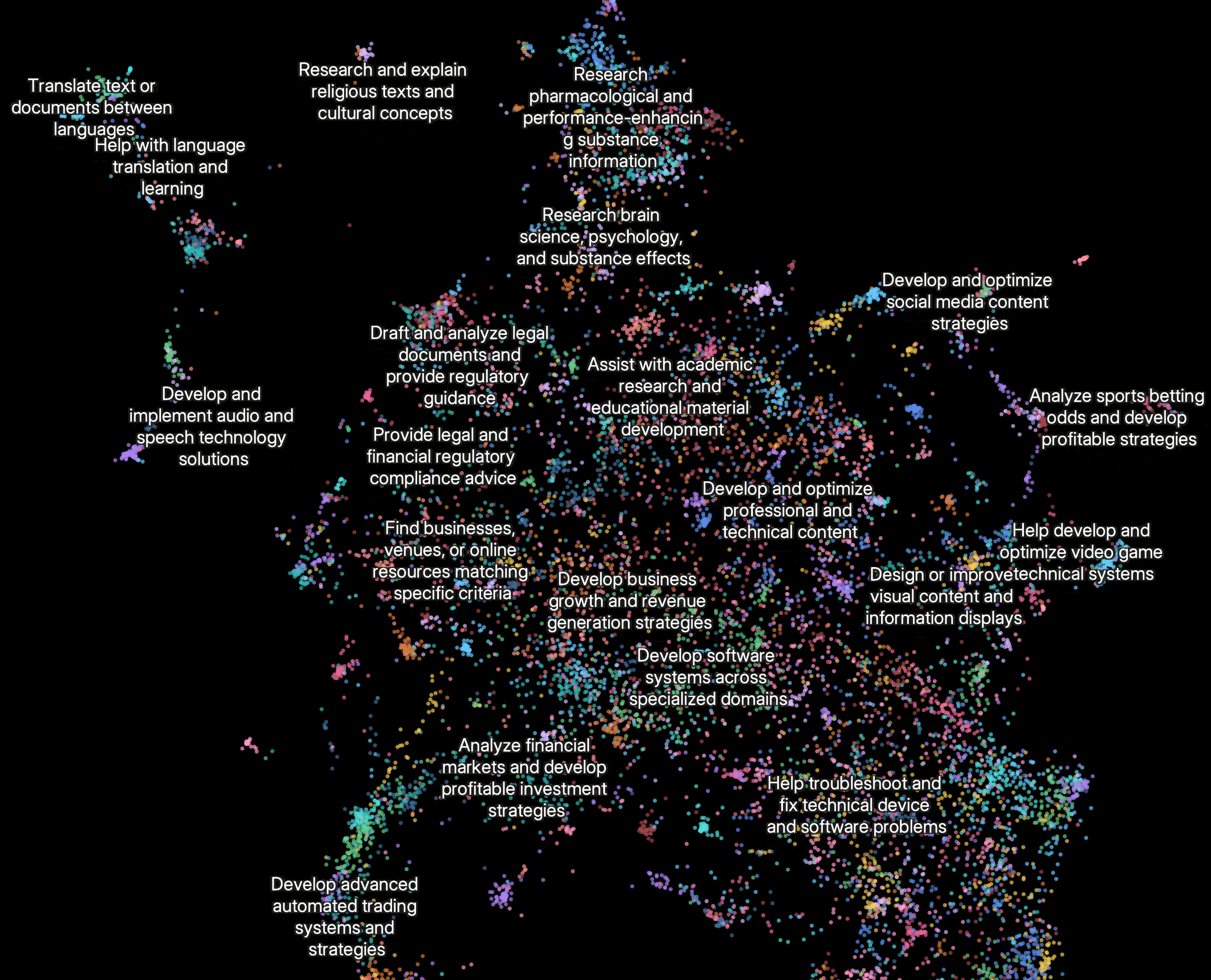 İnsanların bu gün Research xüsusiyyətini ən çox necə istifadə etdiyini göstərən Clio embedding qrafiki. Ən populyar istifadə kateqoriyaları: ixtisaslaşdırılmış sahələr üzrə proqram təminatı sistemlərinin inkişaf etdirilməsi (10%), peşəkar və texniki məzmunun hazırlanması və optimallaşdırılması (8%), biznes artımı və gəlir əldə etmə strategiyalarının hazırlanması (8%), akademik tədqiqat və tədris materiallarının hazırlanmasına kömək (7%), və insanlar, yerlər və ya təşkilatlar haqqında məlumatların araşdırılması və yoxlanılması (5%).
